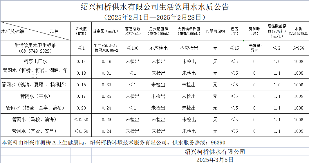 米兰注册水质公告(2025年2月1日—2025年2月28日)