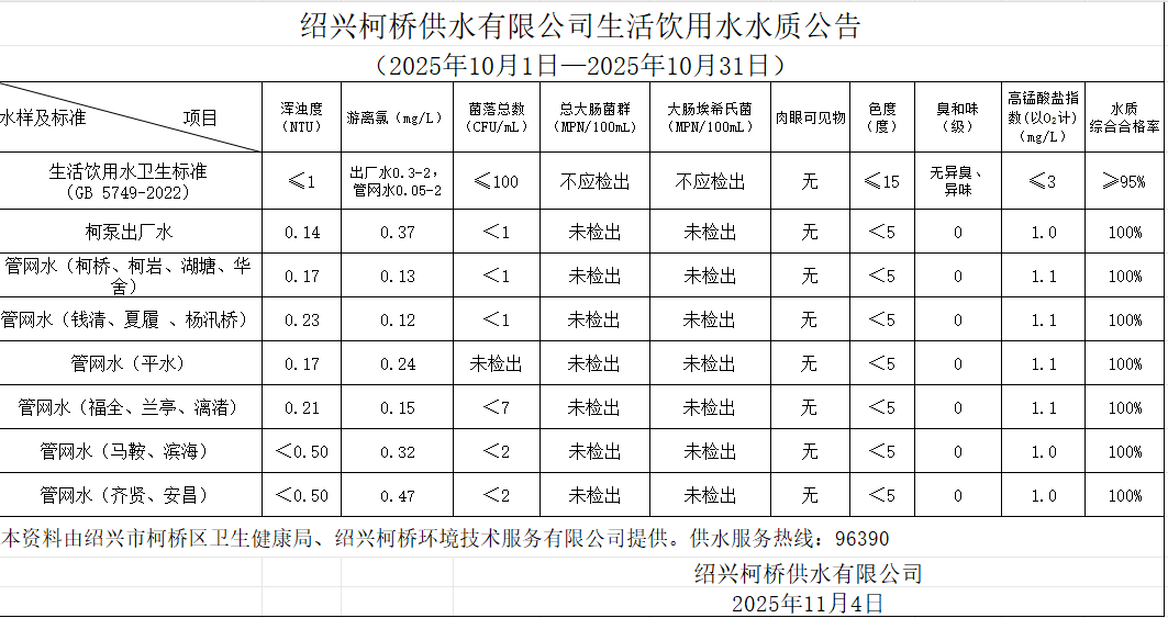 米兰注册水质公告(2025年10月1日—2025年10月31日)
