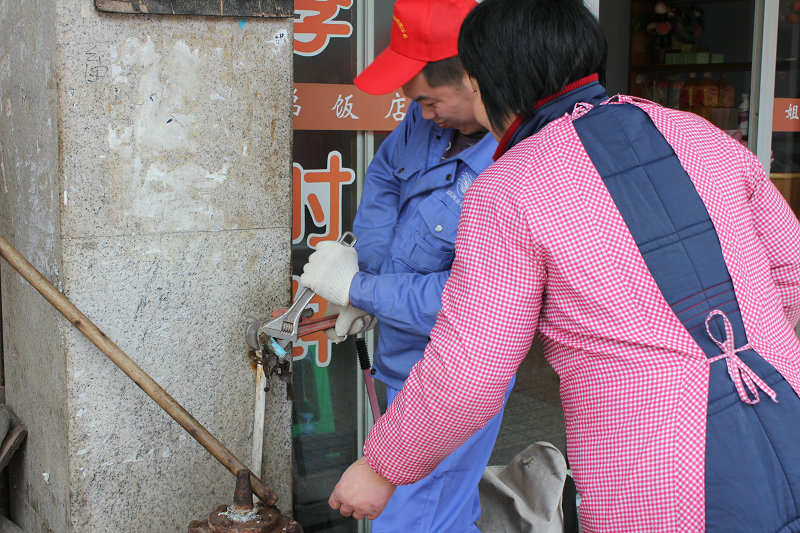 图为集团志愿者为滨海镜海社区居民上门免费维修水管