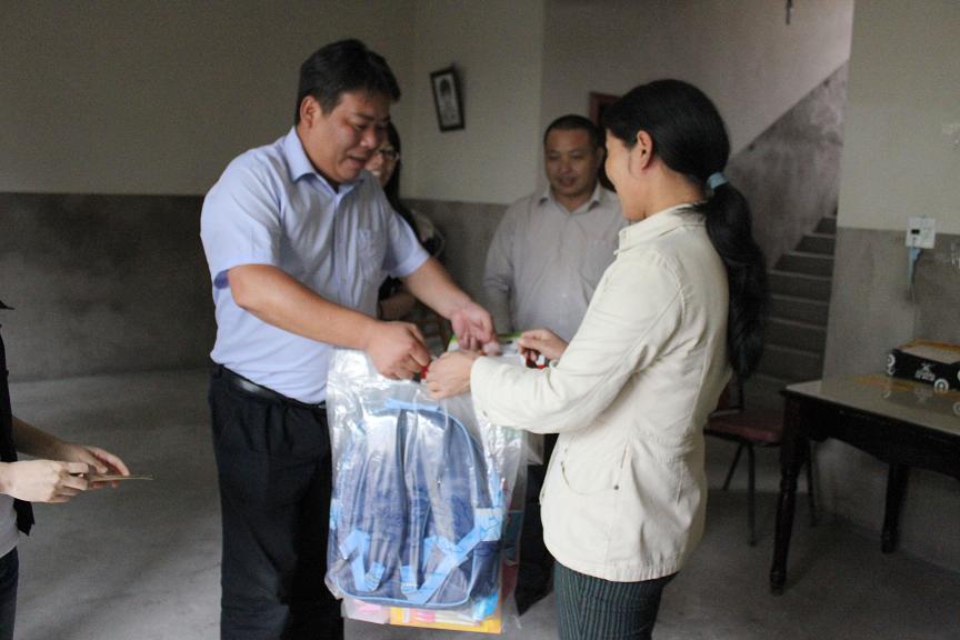 图为滨海供水公司代表为马鞍镇结对贫困儿童送去书包的慰问品及慰问金