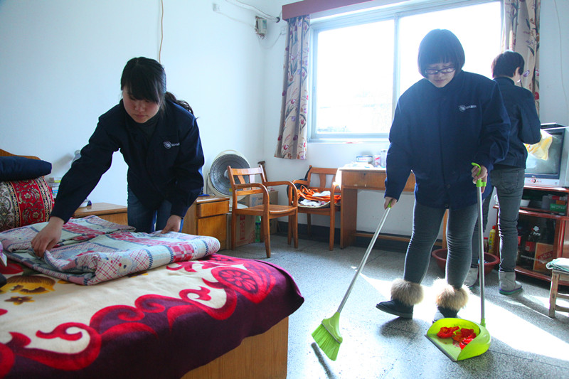 志愿者为夕阳红敬老院老人打扫卫生