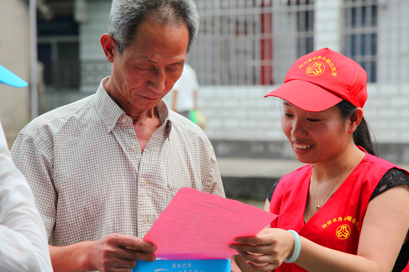 6 月30 日上午,集团公司团委、妇联联合开展“助力五水共治、共创美好家园”宣传活动,水务志愿者们来到大坂湖直江沿岸的华舍街道华舍村、蜀阜村、兴华社区等村(居),向岸边居民宣传“五水共治”,劝导河边居民爱护水环境,不要往河里倒污水、扔垃圾等。