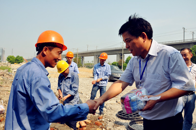 图为董事长周俭慰问供水管道安装工 图为总经理单宝子慰问排水管网养护员