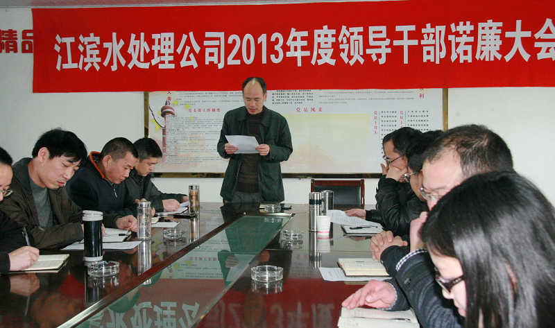 3月26日下午,江滨水处理公司2012年度领导干部诺廉大会在二楼会议室举行,党支部书记傅小春主持会议,公司中层正职以上干部共计9人结合自身工作岗位,就如何加强廉洁自律意识、做好廉政风险防控做出承诺,接受职工监督。