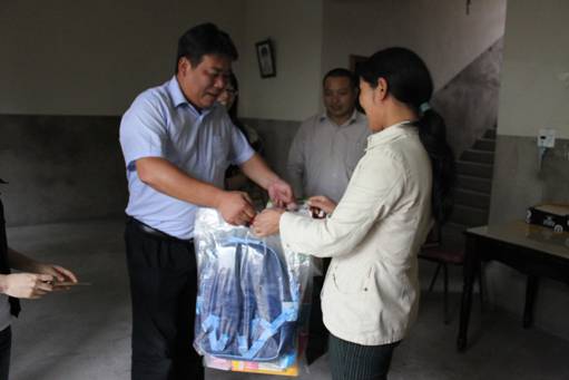 图为公司领导董卫江副总为贫困儿童家庭送上慰问金和学习用品。