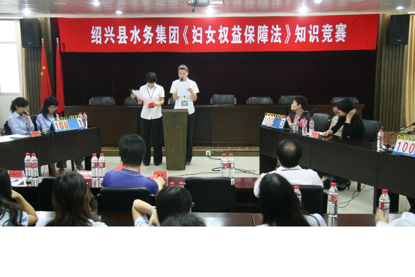 为广泛深入地学习、宣传、贯彻《中华人民共和国妇女权益保障法》,提高广大女职工的法律意识及依法维护自身利益的能力,在“十一”前夕,水务集团妇联举办《中华人民共和国妇女权益保障法》知识竞赛。来自集团机关、供水、排水、水处理公司妇委会等4支女职工代表队参加比赛。本次竞赛以现场答题形式,分个人必答题、小组必答、抢答题和风险题。活动在大家积极踊跃,热情高涨。经过紧张激励的角逐,最终水处理妇委会荣获第一名。