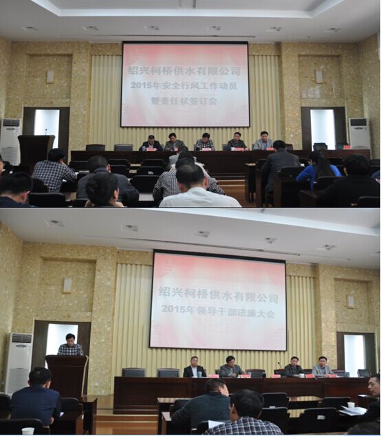 会上,公司领导班子成员及供水分公司经理分别诺廉;安全生产分管副总就2015年安全、行风工作进行了动员部署;公司总经理李叶茂与14个部门(单位)签订了2015年度安全、行风生产责任状。