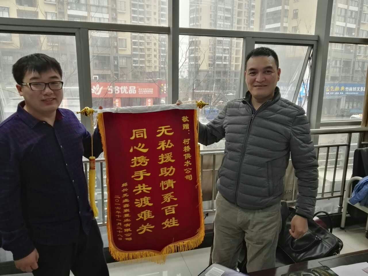 12月5日,二次供水分公司收到绍兴元垄鑫宸置业有限公司大都会项目负责人专程送来的锦旗,对分公司工作人员为大都会样板房场外给水管道建设提供的真情服务表示赞赏和感谢。